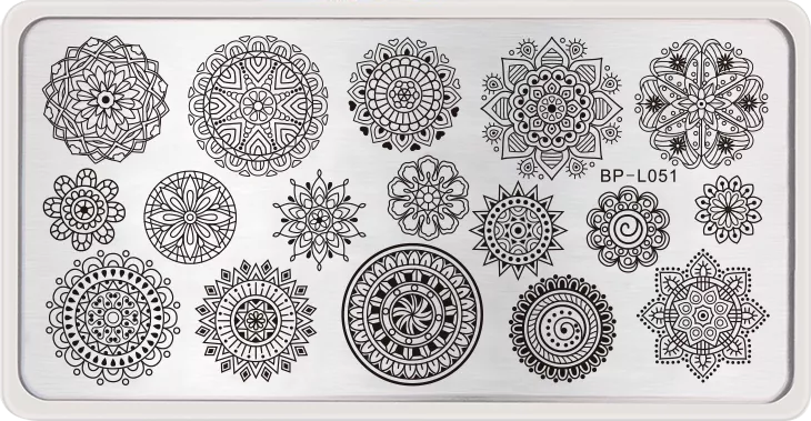Пластина изготовлена из прочного металла. Она гладкая и блестящая, что позволяет наносить высокоточные рисунки с идеальной проработкой даже самых мелких деталей рисунка. Рисунки можно комбинировать, наносить их разными цветами лаков, добавлять стразы, жемчуг, бульйонки, а также любые другие декоративные элементы.