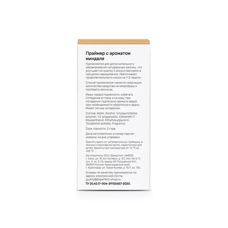 Праймер – препарат, используемый на втором этапе подготовки ресниц перед процедурой наращивания, необходимый для дополнительного очищения ресниц и легкого ухода, препятствующего обезвоживанию ресниц (за счёт PEG-8, это производное полиэтиленгликоля). Содержит компоненты, оказывающие увлажняющее и подтягивающее действие (поливинилпирролидон).