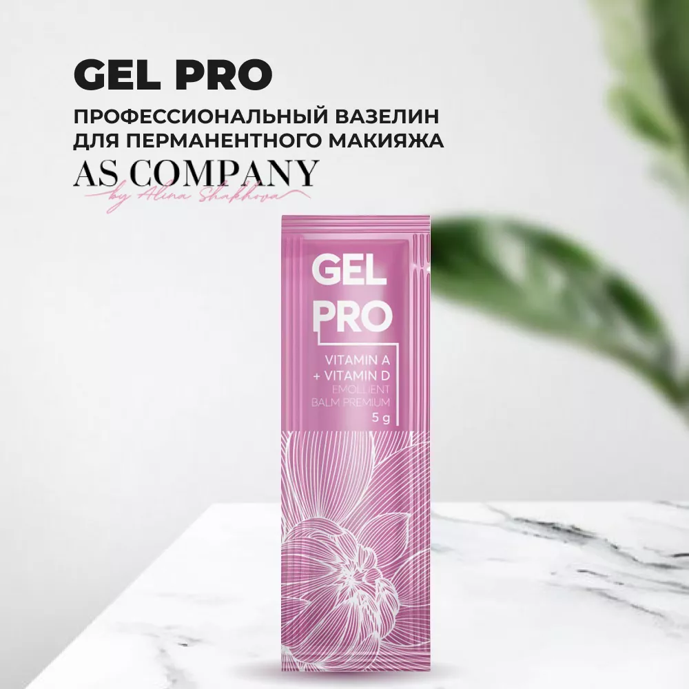 Gel PRO - новая эффективная формула от AS Company. Увлажняющий, профессиональный вазелин для перманентного макияжа и тату. Применяется после процедуры и во время для ускоренного заживления раневой поверхности. Средство позволяет сохранить яркий насыщенный цветовой оттенок. Обогащено витаминами A и D, что чрезвычайно важно для более быстрого восстановления травмированной кожи. Создаёт защитную пленку на длительное время, тем самым образует защитный барьер от условно-патогенных организмов. Подходит для любого типа кожи. В индивидуальной удобной упаковке по 5 гр. Без запаха.