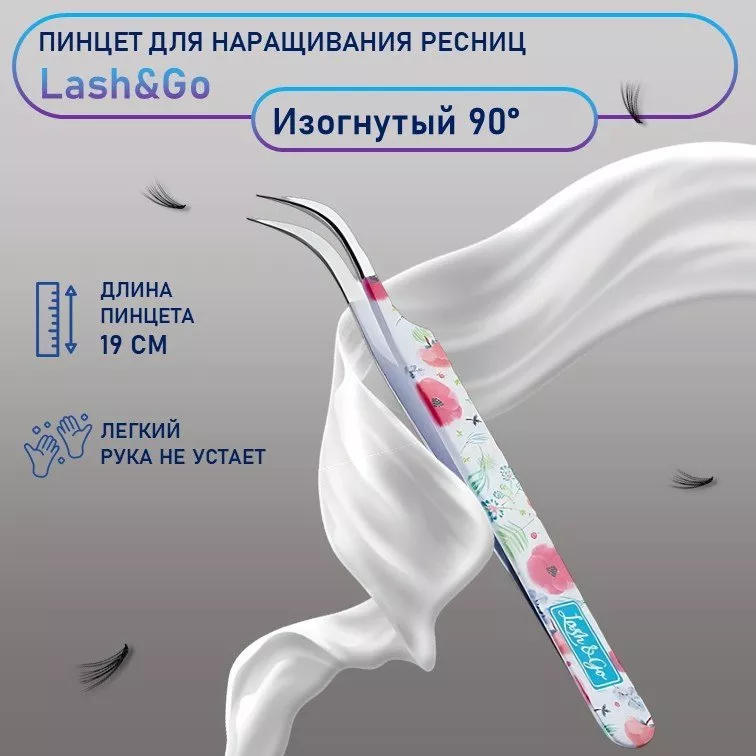 Изогнутый пинцет с углом 90° Lash&Go — универсальный рабочий инструмент. Он подходит как для классического, так и для объемного наращивания.