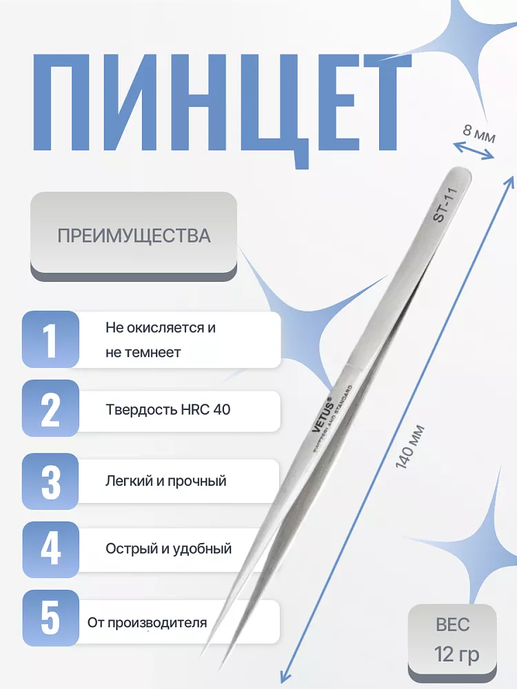 Пинцет с прямым острым наконечником. Изготовлен из специальной нержавеющей стали, антимагнитный, кислотостойкий.