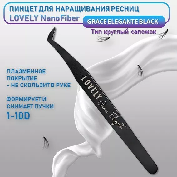 Пинцет для наращивания ресниц Lovely NanoFiber, серия Grace Elegante Black, тип Круглый сапожок.