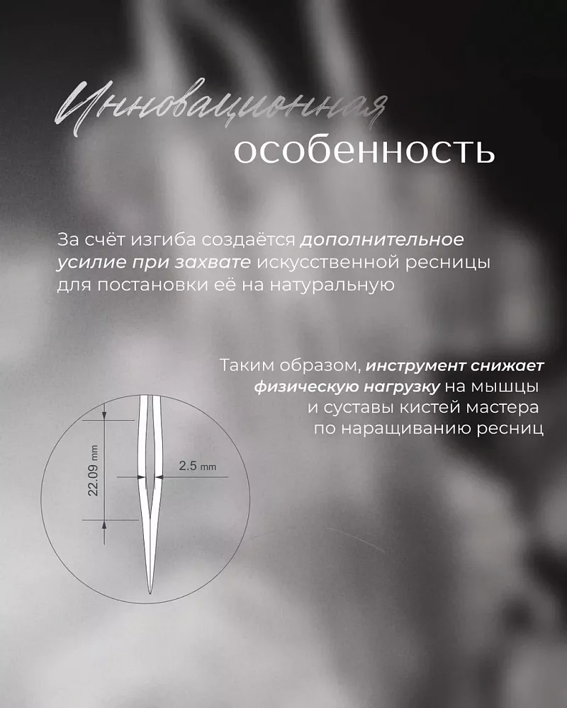 Профессиональный инструмент для точного моделирования ресниц, разработанный с учетом анатомических особенностей работы мастера.