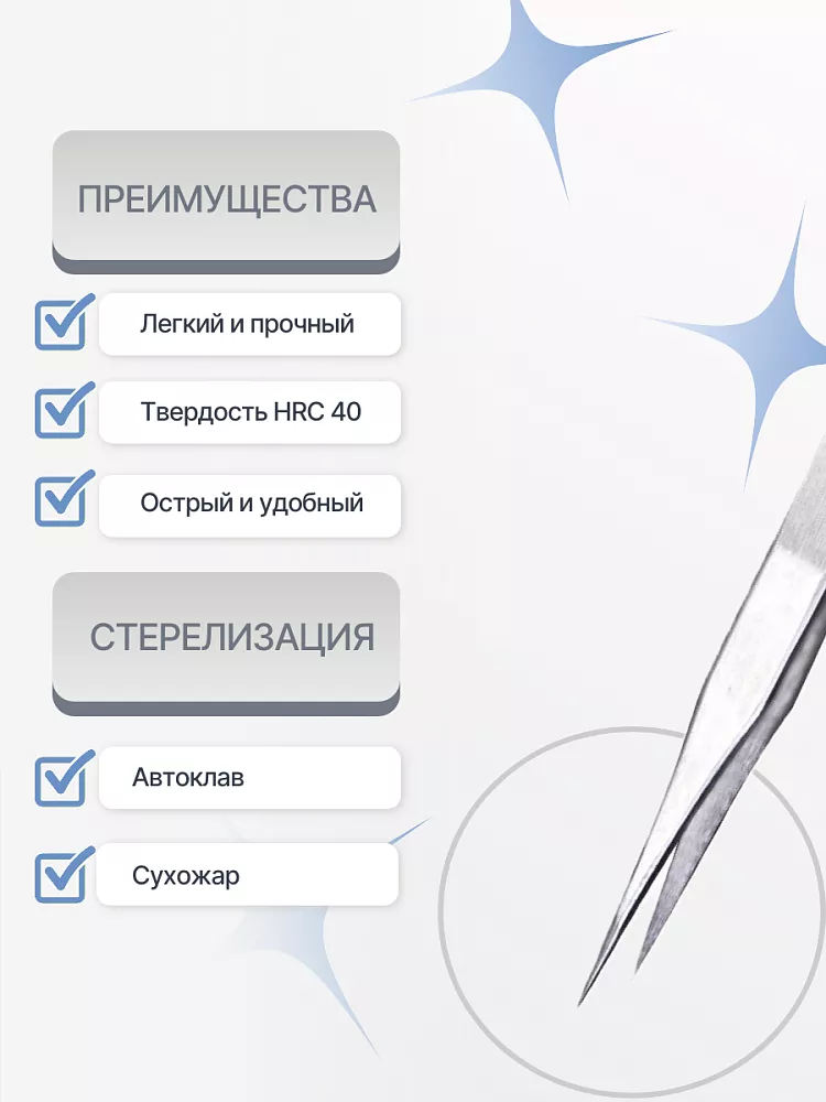 Пинцеты поставляются в защитной упаковке. Рекомендуется использовать в паре для удобства работы. При правильном уходе сохраняют свои рабочие характеристики длительное время.