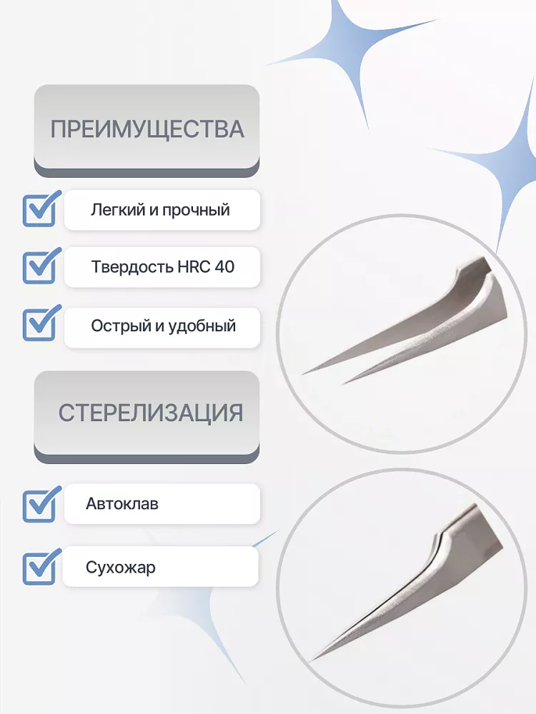 Рекомендация: использование двух пинцетов одновременно значительно повышает эффективность работы и обеспечивает максимальный комфорт при выполнении процедур наращивания ресниц. Особенно рекомендуется для мастеров, работающих с классическими техниками наращивания благодаря точному захвату и удобству в работе.