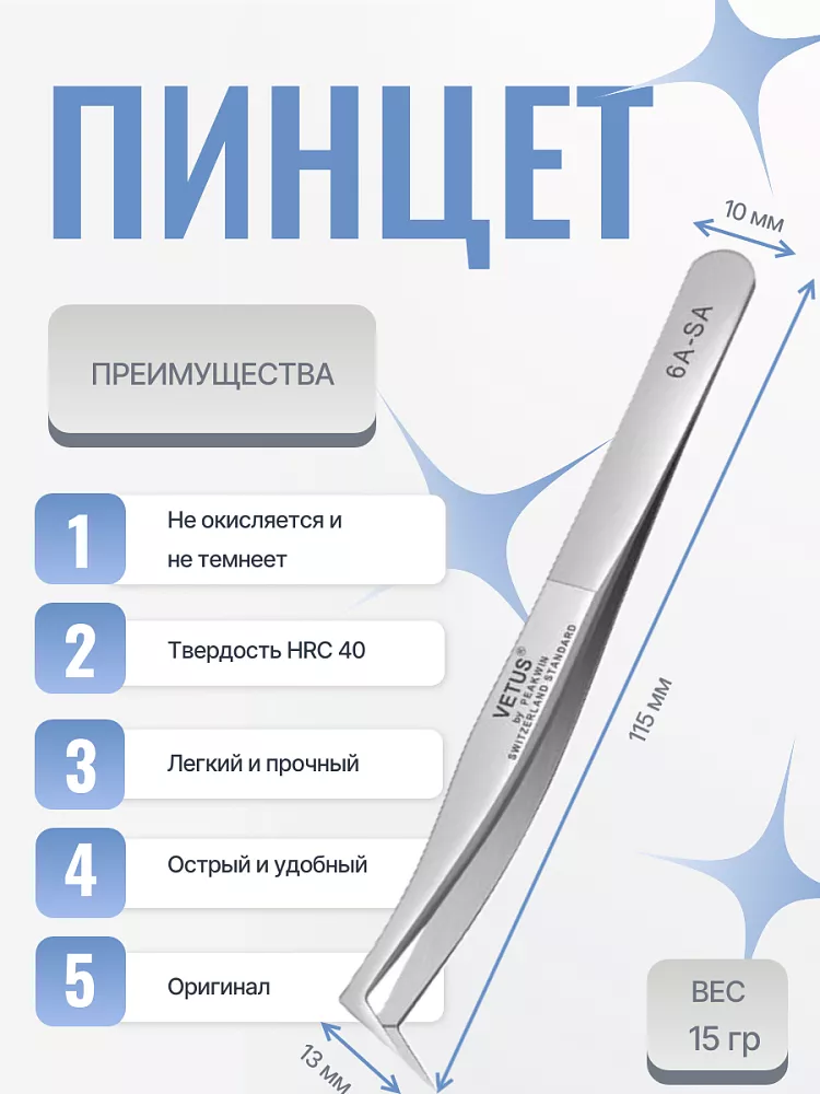 Профессиональные пинцеты Vetus — незаменимые инструменты для мастеров по наращиванию и ламинированию ресниц. Изготовлены из высококачественной нержавеющей стали.  Ключевые достоинства: