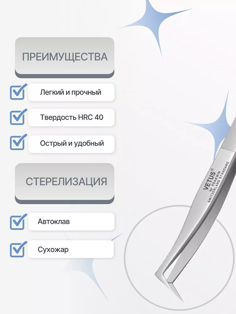Пинцеты Vetus — это надёжные профессиональные инструменты, которые помогут мастеру достичь идеального результата в работе с ресницами. Сочетание качества материалов и продуманной конструкции делает их незаменимыми помощниками в ежедневной практике.