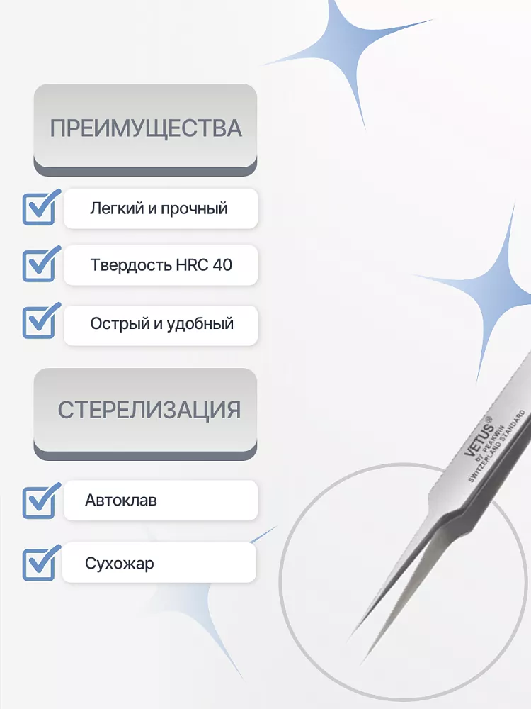 Пинцеты Vetus — это надёжные профессиональные инструменты, которые помогут мастеру достичь идеального результата в работе с ресницами. Сочетание качества материалов и продуманной конструкции делает их незаменимыми помощниками в ежедневной практике.