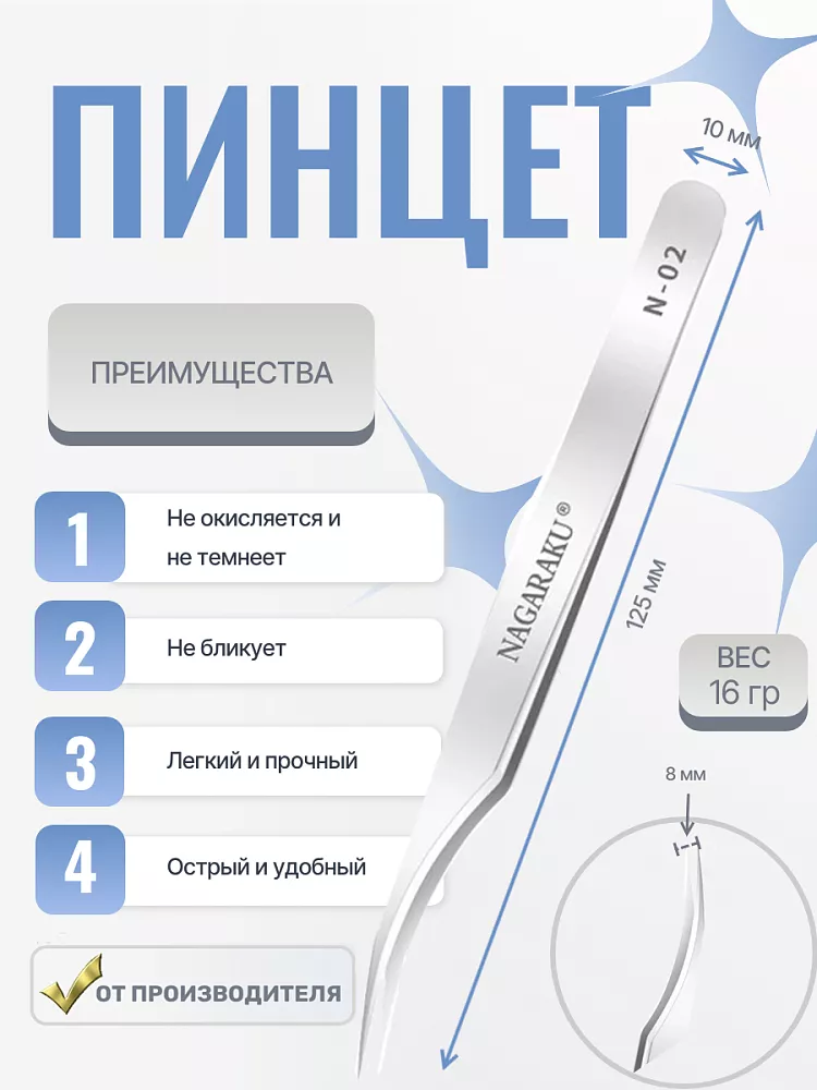 """Профессиональные пинцеты от бренда NAGARAKU — незаменимые инструменты для мастеров по наращиванию ресниц. Изготовлены из высококачественной нержавеющей стали.   Преимущества: