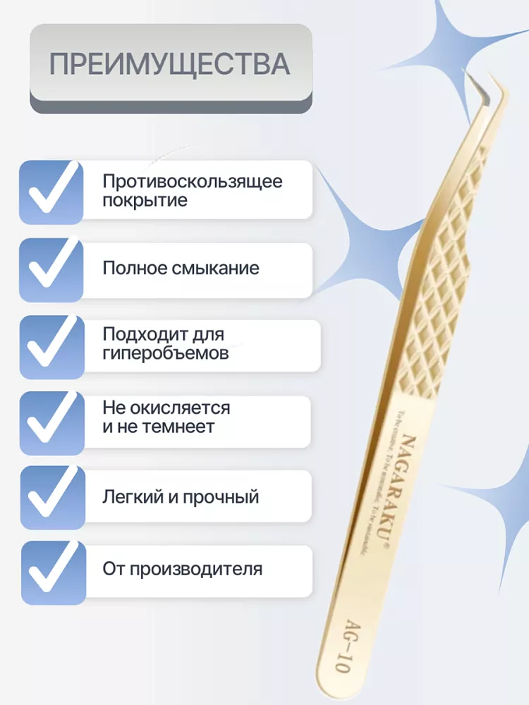 Пинцеты NAGARAKU AG-10 отличаются высоким качеством исполнения и подходят как для начинающих мастеров, так и для профессионалов с опытом.