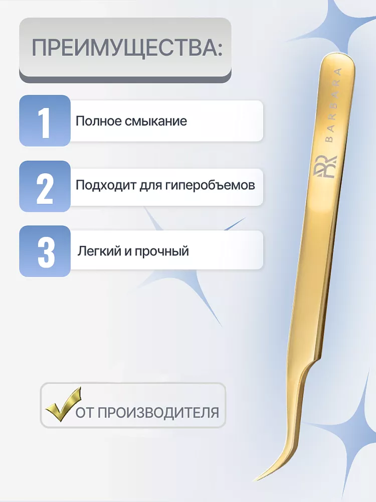 Сверхточный изогнутый пинцет Barbara из серии Gold — профессиональный инструмент для наращивания ресниц. Изготовлен из высококачественной нержавеющей стали с стойким покрытием, обеспечивающим долговечность и устойчивость к коррозии. Изогнутая форма позволяет точно захватывать ресницы и формировать пучки, что особенно важно для объёмного и классического наращивания.