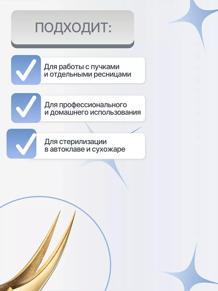 Особенность модели — эргономичная форма «дельфин», которая обеспечивает максимальный контроль при работе: позволяет точно захватывать отдельные ресницы и формировать пучки любой сложности. Благодаря продуманной геометрии пинцет одинаково удобен для классического, объёмного и гиперобъёмного наращивания, а также для коррекции внешних и внутренних уголков глаз.