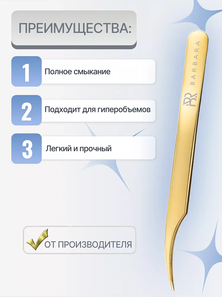 Сверхточный пинцет Barbara серии Gold типа «дельфин» — профессиональный инструмент для мастеров по наращиванию ресниц. Изготовлен из высококачественной нержавеющей стали с износостойким покрытием, гарантирующим долговечность и устойчивость к коррозии.