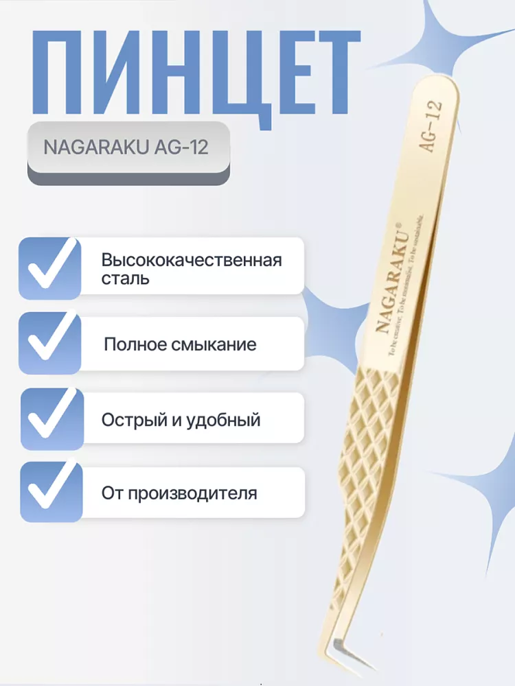 Пинцет Nagaraku AG‑12 — профессиональный инструмент для наращивания ресниц, изготовленный из высококачественной нержавеющей стали. Обеспечивает точное и удобное захватывание ресниц, гарантирует надёжный хват и комфортное позиционирование во время работы. Эргономичная форма пинцета снижает нагрузку на кисть мастера, позволяя выполнять процедуру максимально аккуратно и быстро. Инструмент отличается прочностью, долговечностью и гигиеничностью, не требует дополнительной заточки и сохраняет рабочие свойства в течение длительного времени. Подходит для всех техник наращивания — от классического до объёмных эффектов. Незаменимый помощник для профессионалов, ценящих качество и удобство в работе.