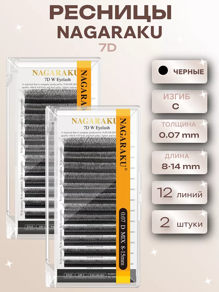 Мечтаете о густых ресницах без ежедневного использования туши? Nagaraku 7D Black — это идеальное решение. 7D создает эффект роскошного бархатистого объема, который видно с любого ракурса. Тонкий ворс 0,07 мм и классический изгиб С делают ресницы очень удобными и естественными. В упаковке 12 линий с плавным переходом длины от 8 до 14 мм. Вы получаете сразу две единицы товара, что особенно удобно для длительного использования.