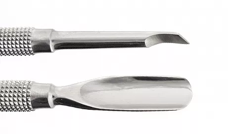 Двухссторонний пушер ZINGER: лопатка предназначена для отодвигания кутикулы и удаления гель-лака, при помощи скошенного топорика можно идеально очистить ногтевую пластину и зону боковых валиков. Материал: медицинская сталь