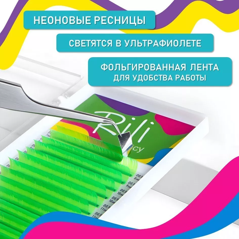 Зеленые неоновые ресницы Rili для самых ярких акцентов и смелых решений! Поразят не только насыщенным цветом, но и сиянием в ультрафиолетовом освещении.