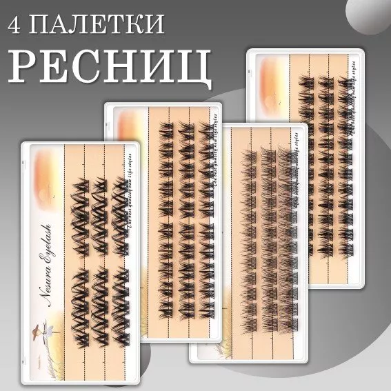 Набор из четырёх разных палиткок накладных пучковых ресниц — это универсальный комплект для создания разнообразных образов. С его помощью вы сможете экспериментировать с длиной, объёмом и формой пучков, чтобы подчеркнуть красоту ваших глаз.