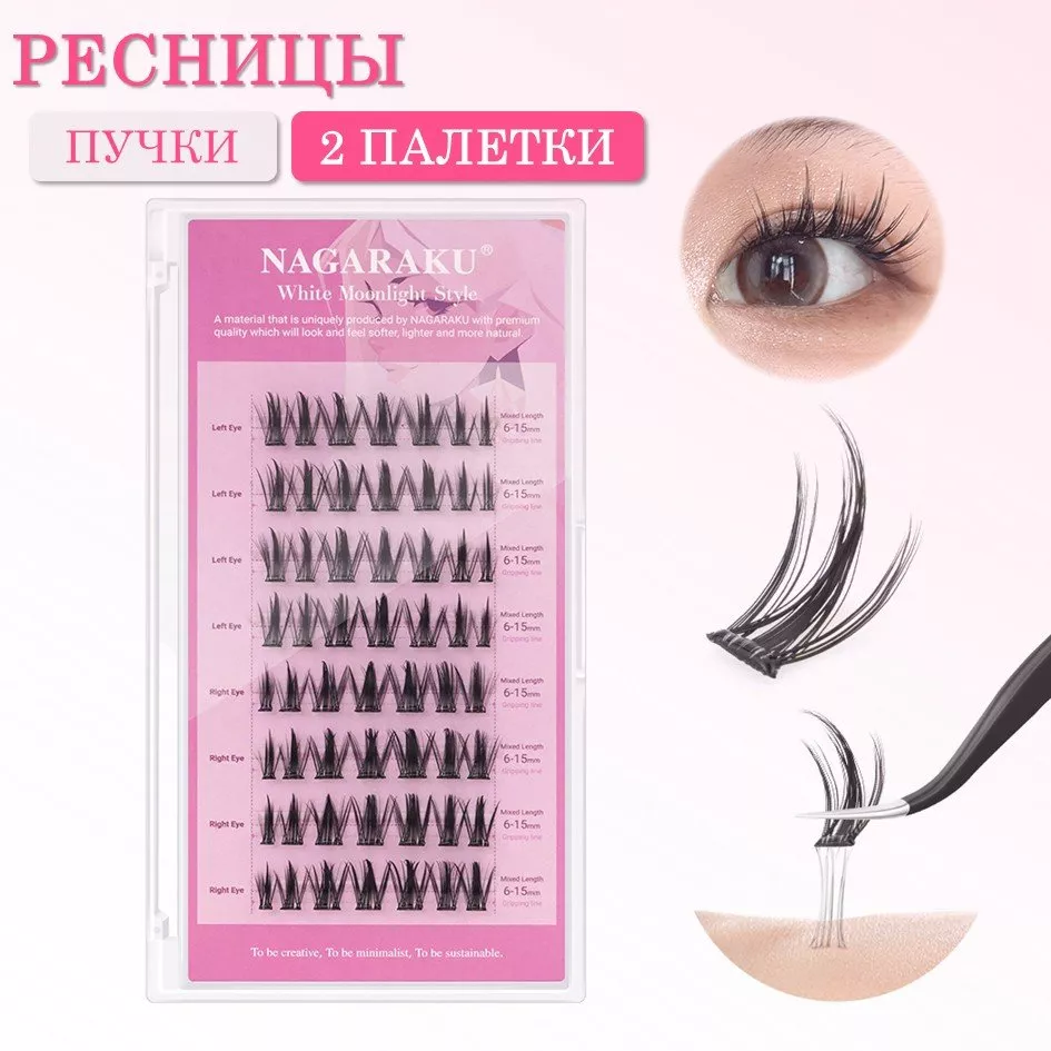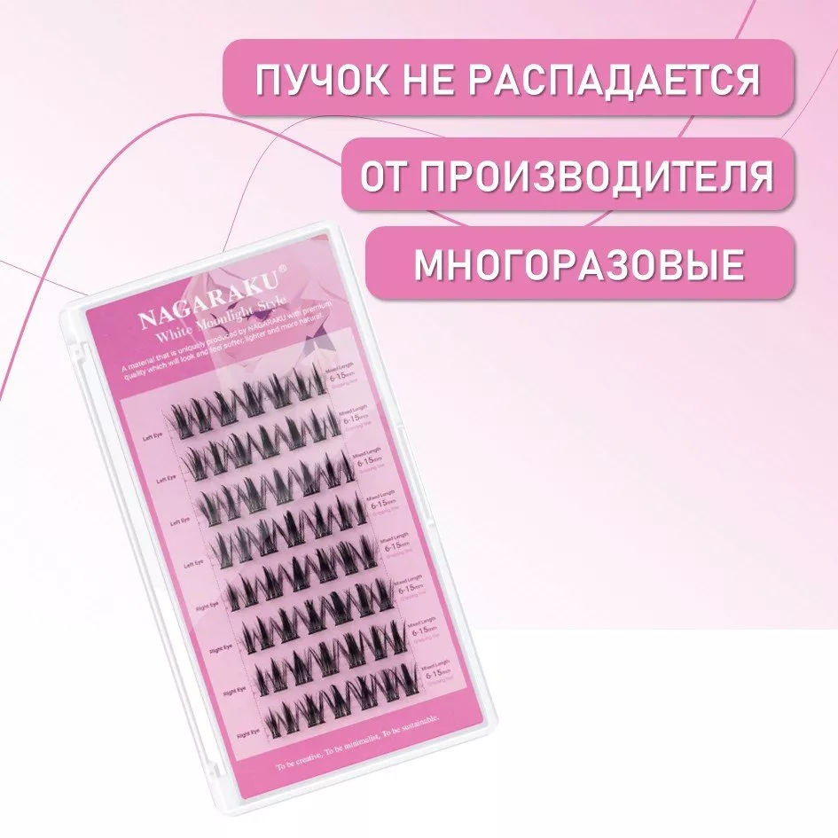 NAGARAKU представляет линейку самоклеящихся ресниц в готовых пучках с естественным изгибом C, предназначенных для создания различных эффектов выразительности взгляда.