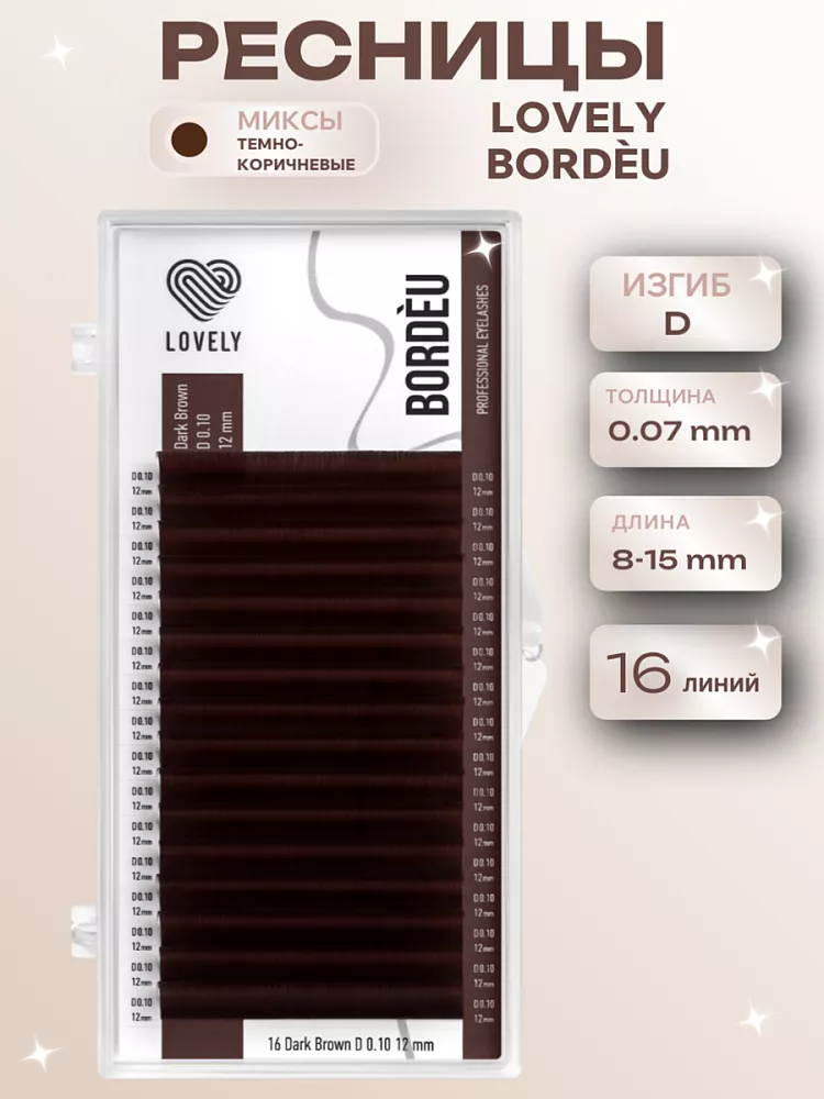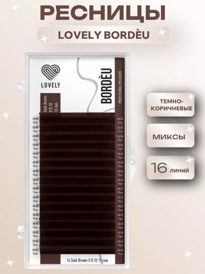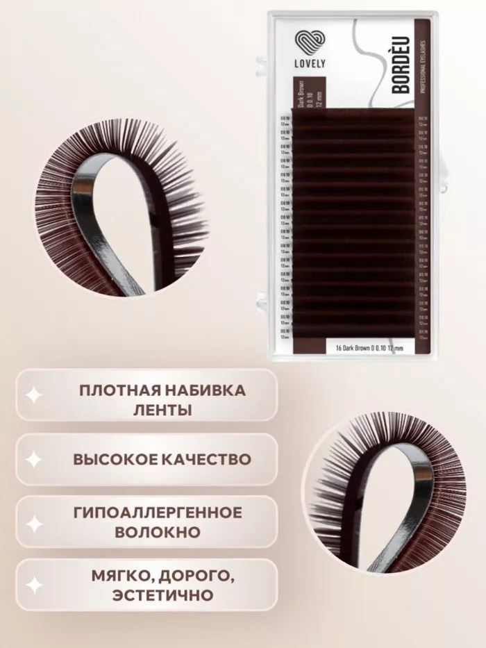 Ресницы тёмно‑коричневые LOVELY Bordèu (16 линий) — профессиональный продукт для наращивания, который придаёт взгляду особую глубину и выразительность. Оттенок с тёплым бордовым подтоном деликатно усиливает естественную красоту глаз: подчёркивает карие и зелёные радужки, гармонично сочетается со смуглой кожей и тёмными волосами. Под разным освещением цвет играет полутонами — от бархатного бордового до глубокого бургунди с пурпурными нотками. Ресницы создают эффект лёгкого, благородного макияжа, добавляя образу мягкую эмоциональность и особый характер. Продукт сочетает премиальную эстетику, качество исполнения и удобство работы — оптимальный выбор для мастеров, ценящих гармонию цвета и изысканный результат.