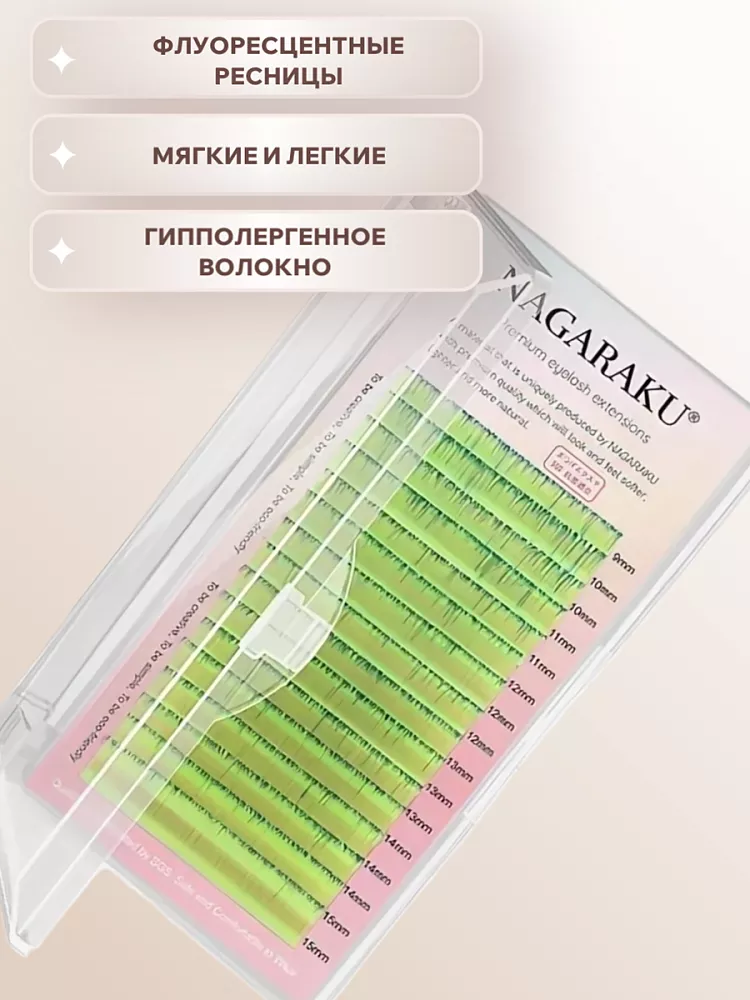 Цветные ресницы Nagaraku Fluorescent Green — смелое решение для креативного наращивания. Синтетические волокна ярко-зелёного оттенка придадут взгляду выразительность и индивидуальность, помогут выделиться из толпы. Идеально подходят для создания праздничных или тематических образов — от вечеринок до фотосессий. Лёгкие и упругие, не утяжеляют веки, не вызывают дискомфорта. Сохраняют форму в течение всего периода носки, устойчивы к осыпанию. Легко фиксируются любым профессиональным клеем.
