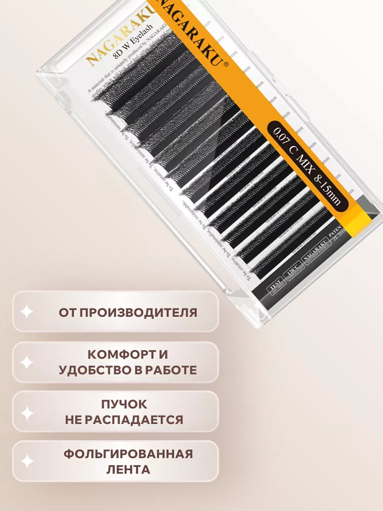 Чёрные пучковые ресницы Nagaraku 8D Black (12 линий) — профессиональный материал для объёмного наращивания, создающий эффект максимальной густоты и выразительности. Технология 8D предполагает многослойное расположение волокон в пучке, благодаря чему достигается впечатляющий объём при сохранении лёгкости и естественности взгляда.