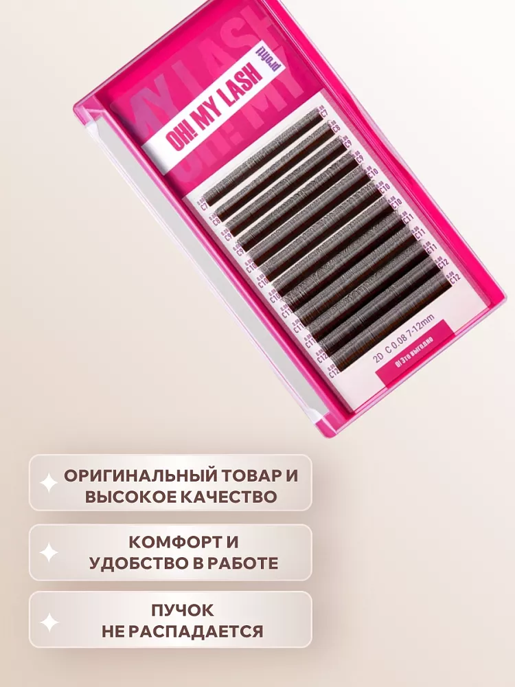 Ресницы чёрные OH! MY LASH в пучках 2D (12 линий, MIX) — профессиональный материал для наращивания, позволяющий создать естественный объём с эффектом лёгкой густоты. Каждый пучок состоит из двух ресничек на одной ножке, что обеспечивает аккуратный и выразительный результат без утяжеления взгляда. Матовые волокна максимально приближены к натуральным ресницам, сохраняют форму на протяжении всего срока носки. Плотная укладка на ленте упрощает работу мастера: пучки легко отделяются, не распадаются при захвате пинцетом и надёжно фиксируются. Набор сочетает удобство применения, экономичность расхода и универсальность — подходит как для классического, так и для объёмного наращивания.