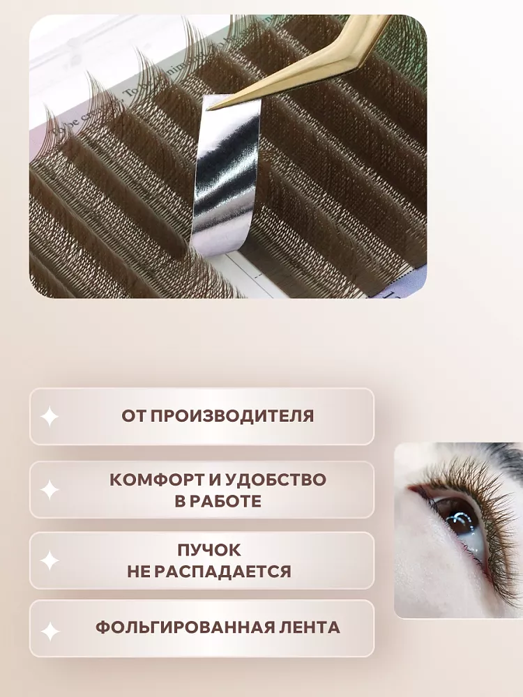 Коричневые ресницы‑пучки YY от Nagaraku — профессиональный материал для натурального и мягкого объёмного наращивания. Тёплый коричневый оттенок создаёт деликатный, ненавязчивый эффект, идеально подходящий для дневного макияжа, образов в стиле clean beauty и no‑makeup look. Ресницы изготовлены из высококачественного синтетического волокна: они лёгкие, эластичные, не утяжеляют веко и обеспечивают комфортное ношение. Структура пучков продумана до мелочей — равномерное распределение волокон гарантирует естественный объём без перегруженности. Пучки размещены на клейкой подложке с фольгированным основанием, которую можно многократно переклеивать без потери липкости, что упрощает работу мастера и экономит время.