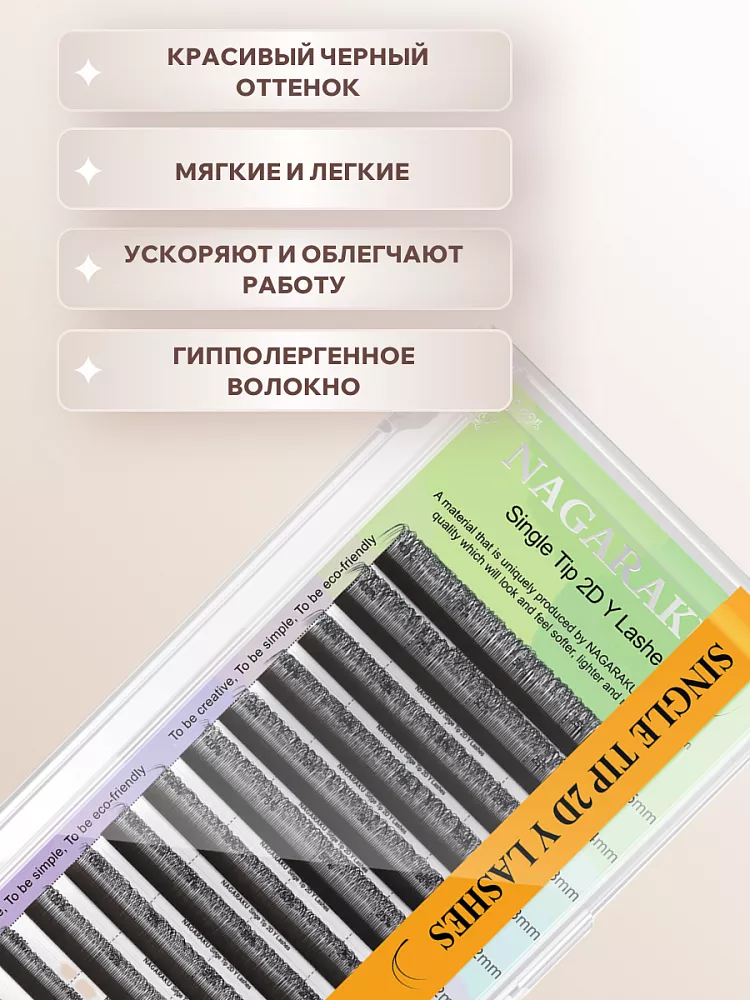 Ресницы‑пучки 2D Single Tip чёрные 12 линий от Nagaraku — профессиональный материал для качественного объёмного наращивания. Готовые пучки экономят время мастера и позволяют добиться выразительного, но естественного эффекта: каждый пучок состоит из двух волокон с одним общим кончиком, что создаёт мягкий объём без перегруженности. Ресницы изготовлены из высококачественного синтетического моноволокна — они лёгкие, эластичные, не утяжеляют веко и обеспечивают комфортное ношение на протяжении всего срока носки. Насыщенный чёрный цвет равномерно прокрашен по всей длине, подчёркивая глубину и выразительность взгляда. Пучки размещены на клейкой подложке с фольгированным основанием: её можно многократно переклеивать без потери липкости и следов, что упрощает работу и снижает расход материала.