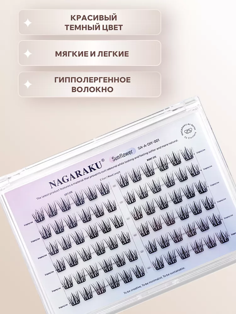 Ресницы‑пучки самоклеящиеся Nagaraku Sunflower Style — удобное решение для создания выразительного взгляда без похода в салон. Ресницы изготовлены из мягкого синтетического моноволокна: они не вызывают раздражения, не утяжеляют веко и обеспечивают приятное ощущение при носке. Самоклеящаяся основа позволяет быстро и надёжно фиксировать пучки — специальный клей уже нанесён на основание, что экономит время и исключает необходимость дополнительно подбирать клеевой состав. Пучки представлены в оптимальной длине (10–12 мм), подходят для создания как естественного, так и более драматичного объёма. В упаковке — достаточное количество пучков для экспериментов с формой и плотностью: можно моделировать лисий, кукольный или аниме‑эффект в зависимости от желаемого образа. Продукт сочетает простоту использования, высокое качество материалов и стойкий результат — ресницы сохраняют форму и выразительность в течение всего дня. Идеальны как для домашнего применения, так и для работы мастеров, которые ценят удобство и оперативность в создании безупречного взгляда.