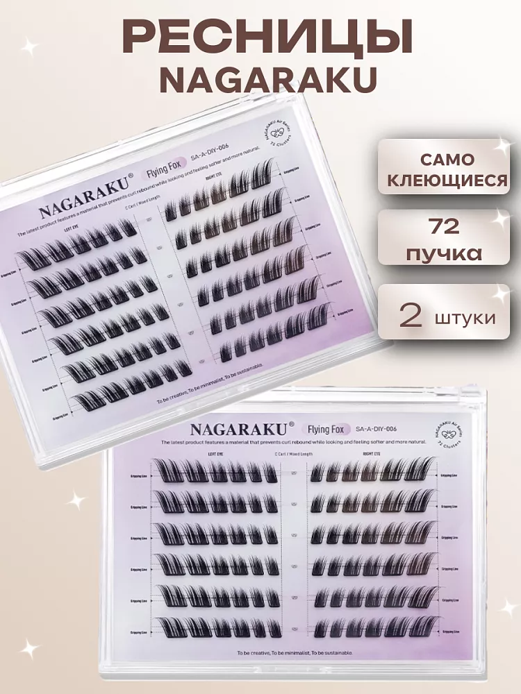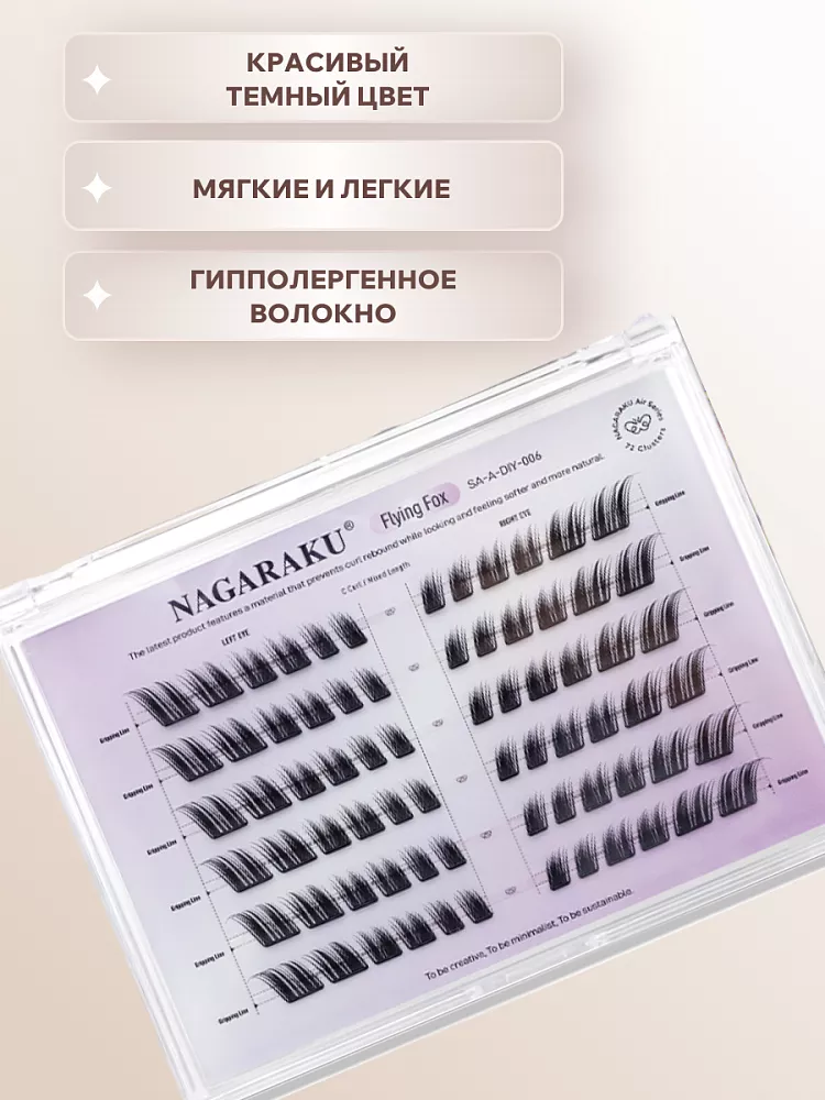 Самоклеящиеся ресницы‑пучки Nagaraku Flying Fox Style — практичный набор для создания выразительного, «лисьего» взгляда в домашних условиях. Ресницы выполнены из мягкого синтетического моноволокна, которое не утяжеляет веко, не вызывает раздражения и обеспечивает комфортное ношение в течение всего дня. Самоклеящаяся основа уже содержит клеевой слой — вам не понадобится дополнительно подбирать клей. Особенность модели — продуманный изгиб и распределение волокон, которые создают эффект «распахнутого» взгляда с лёгким удлинением к внешнему уголку глаза, придавая образу игривость и выразительность. Длина пучков (10–14 мм) и толщина 0,07 мм обеспечивают естественный вид и объём без перегруженности. В упаковке достаточно пучков для экспериментов с интенсивностью эффекта — от деликатного дневного до яркого вечернего образа. Клейкая подложка с фольгированным основанием выдерживает многократное переклеивание без потери липкости, минимизируя отходы и упрощая работу. Продукт сочетает удобство использования, качество материалов и профессиональный результат: с Nagaraku Flying Fox Style вы легко создадите стильный взгляд без посещения салона.