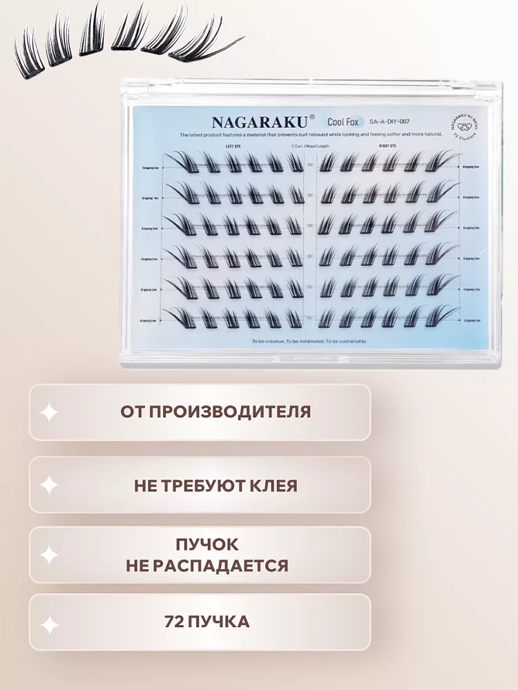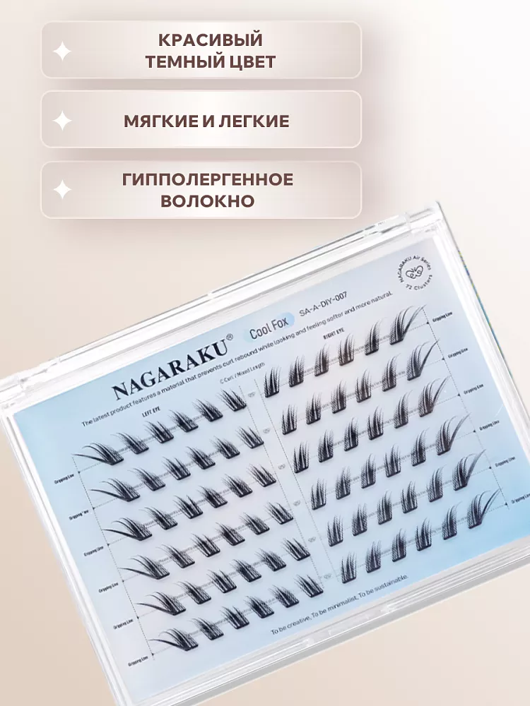 Самоклеящиеся ресницы‑пучки Nagaraku Cool Fox Style — удобное решение для создания выразительного «лисьего» взгляда в домашних условиях. Ресницы изготовлены из мягкого синтетического моноволокна, которое не утяжеляет веко, не вызывает раздражения и обеспечивает комфортное ношение в течение всего дня. Самоклеящаяся основа уже содержит клеевой слой — вам не нужно дополнительно подбирать и наносить клей. Особенность модели — специально продуманный изгиб и распределение волокон, которые создают эффект удлинения к внешнему уголку глаза, придавая взгляду игривость, глубину и характерную «лисью» форму.