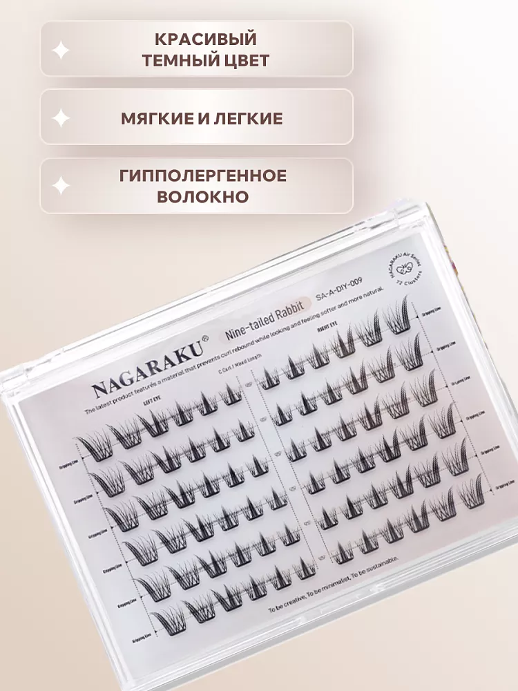 Самоклеящиеся ресницы‑пучки Nagaraku Nine-tailed Rabbit Style — стильное решение для создания эффектного, запоминающегося взгляда. Ресницы изготовлены из высококачественного синтетического моноволокна, обеспечивающего лёгкость, комфорт и отсутствие раздражения при длительном ношении. Благодаря самоклеящейся основе с готовым клеевым слоем вам не потребуется дополнительно подбирать клей . Отличительная черта модели — особый дизайн пучков, имитирующий изящный «заячий» эффект с деликатным удлинением и объёмом, который придаёт взгляду игривость и выразительность без излишней драматичности.