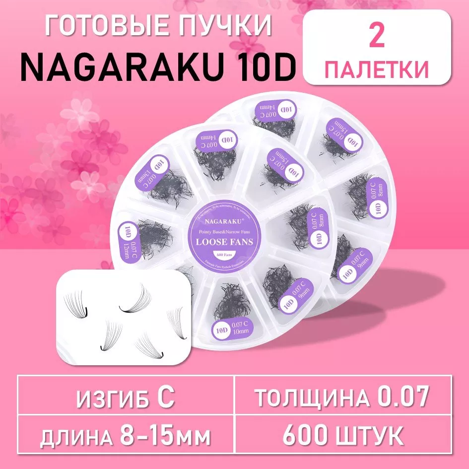 Готовые пучки 10D Nagaraku (600 штук) — профессиональный материал для создания максимально выразительного, роскошного объёма при наращивании ресниц. Каждый пучок состоит из 10 тонких волокон, что обеспечивает насыщенный, эффектный результат с глубокой текстурой и завораживающей густотой. Ресницы изготовлены из высококачественного синтетического волокна: они сохраняют форму, не заламываются, отличаются упругостью и эластичностью, при этом остаются лёгкими и комфортными в носке. Толщина волокон 0,07 мм и варьируемая длина (8–15 мм) позволяют подбирать оптимальное сочетание для любого типа глаз и желаемого эффекта — от драматичного вечернего до умеренно выразительного дневного образа. Пучки размещены на клейких подложках с фольгированным основанием, которые выдерживают многократное переклеивание без потери липкости, что существенно экономит материал и упрощает работу мастера. Продукт подходит как для опытных лэш‑специалистов, так и для тех, кто осваивает объёмное наращивание: с Nagaraku 10D вы сможете быстро добиться стойкого, безупречного результата, соответствующего актуальным трендам индустрии.