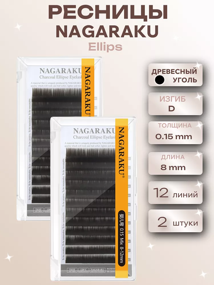 Ресницы NAGARAKU Premium Ellips древесный уголь 12 линий D 0.15 8, 2 шт