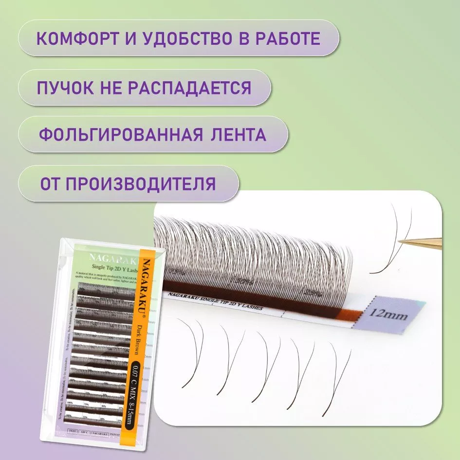 Ресницы‑пучки Nagaraku 2D Single tip в тёмно‑коричневом оттенке (12 линий) — элегантный выбор для создания натурального объёма и мягкого выразительного взгляда. Тёмно‑коричневый цвет придаёт взгляду тёплую глубину, органично сочетаясь с разными типами внешности и вариантами макияжа — от дневного до вечернего. Особенность модели — конструкция Single tip: каждый пучок сформирован из двух волокон, сходящихся у основания и слегка расходящихся на кончике, что создаёт эффект естественных, слегка подкрученных ресниц без излишней драматичности. Толщина волокон 0,07 мм обеспечивает лёгкость и комфорт в носке, а варьируемая длина (8–15 мм) позволяет подбирать оптимальное сочетание для любого типа глаз и желаемого эффекта — от деликатного объёма до более насыщенного образа.