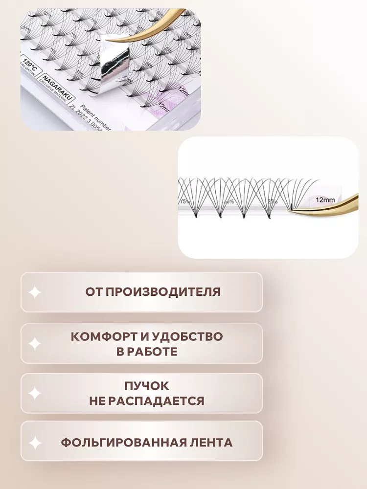 Готовые пучки ресниц Nagaraku 7D — это материал для наращивания из синтетического матового моноволокна, максимально имитирующий натуральные ресницы. Продукт обеспечивает выразительный объёмный эффект за счёт формирования пучка из 7 отдельных ресниц. Материал отличается повышенной прочностью, хорошо держит форму, не вызывает аллергических реакций и гарантирует комфорт при носке. Пучки экономят время мастера благодаря плотному набитию ленты и большому количеству пучков в палетке.