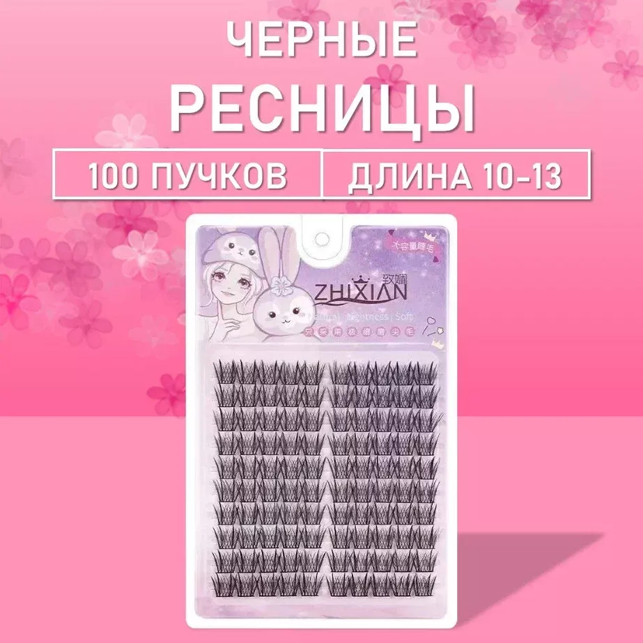 Набор черных пучковых ресниц для создания выразительного объема. Оптимальное количество – 100 пучков – позволяет выполнить несколько наращиваний или создать плотный объем на полный ресничный край.