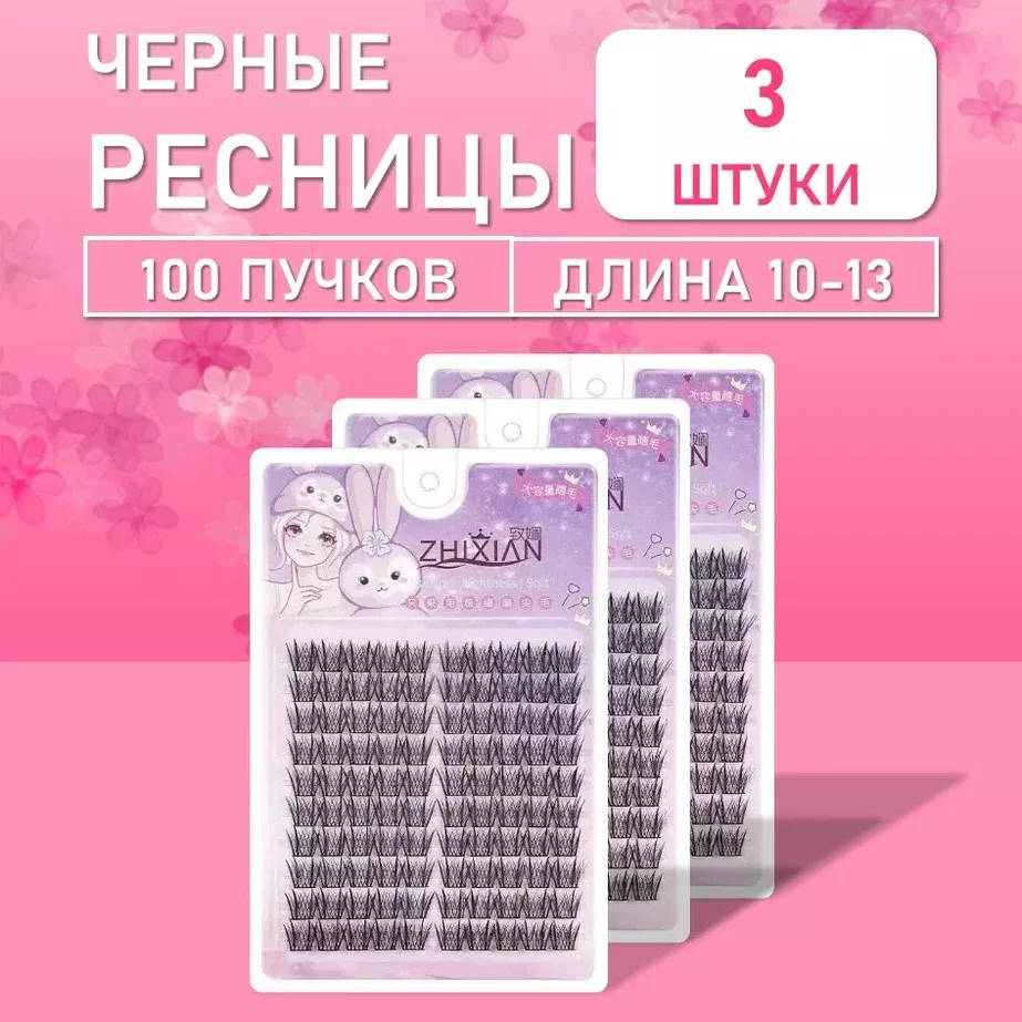 Набор черных пучковых ресниц для создания выразительного объема. Оптимальное количество – 100 пучков – позволяет выполнить несколько наращиваний или создать плотный объем на полный ресничный край.