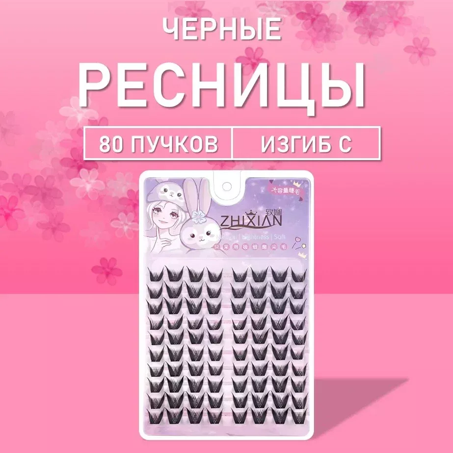 Набор черных пучковых ресниц для создания выразительного объема. Оптимальное количество – 80 пучков – позволяет выполнить несколько наращиваний или создать плотный объем на полный ресничный край.