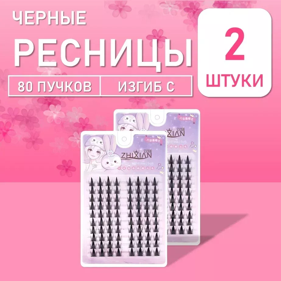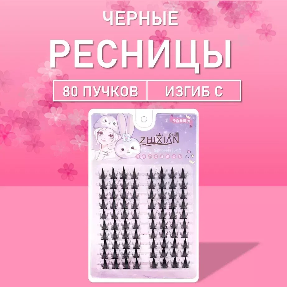 Набор черных пучковых ресниц для создания выразительного объема. Оптимальное количество – 80 пучков – позволяет выполнить несколько наращиваний или создать плотный объем на полный ресничный край.