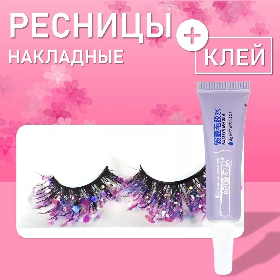 Накладные пучковые ресницы с фиолетовыми блестками (с клеем)