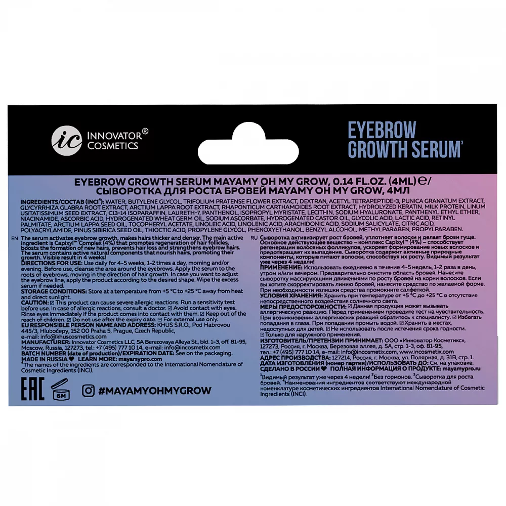 Сыворотка Oh My Grow питает и уплотняет волоски, делает брови гуще, но главное — активизирует рост новых волосков. Видимый результат уже через 4 недели! Сыворотка эффективна для бровей, поврежденных в результате частых коррекций, окрашивания, татуажа и других косметических процедур, в антивозрастном уходе, при выпадении из-за сезонных факторов.