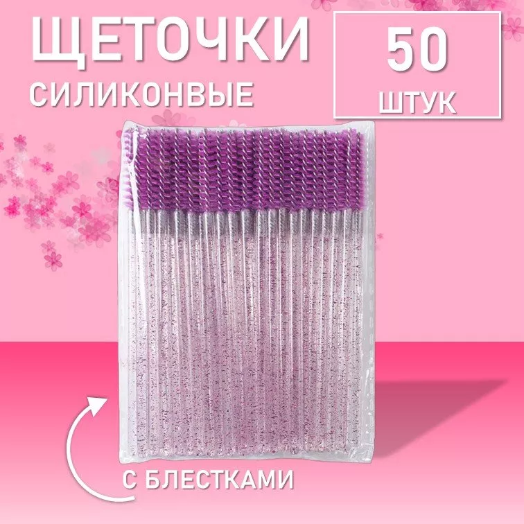 Ворсовые щеточки для ресниц с блестками фиолетовые 50 шт