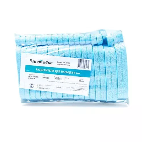 Одноразовые разделители для пальцев выпускаются в разных цветах. Белые используются для клиентов с повышенной чувствительностью, а также за счет универсального цвета подойдут для любого стиля салона. Разделители из голубого пенополиэтилена являются универсальными по цене и плотности.