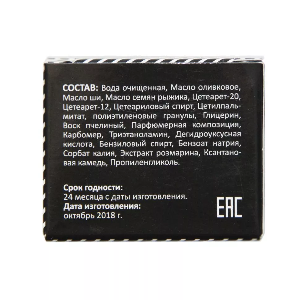 Состав: Вода очищенная, Масло оливковое, Масло ши, Масло семян рыжика, Цетеарет-20, Цетеарет-12, Цетеариловый спирт, Цетилпальмитат, полиэтиленовые гранулы, Глицерин, Воск пчелиный, Парфюмерная композиция, Карбомер, Триэтаноламин, Дегидроуксусная кислота, Бензиловый спирт, Бензоат натрия, Сорбат калия, Экстракт розмарина, Ксантановая камедь, Пропиленгликоль.