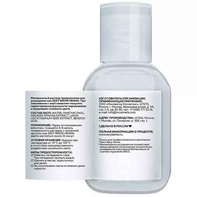 Специальная жидкость для разведения хны Sexy Brow Henna. Не препятствует проникновению пигмента вглубь волосков и кожи, обеспечивая качественное и стойкое окрашивание бровей.