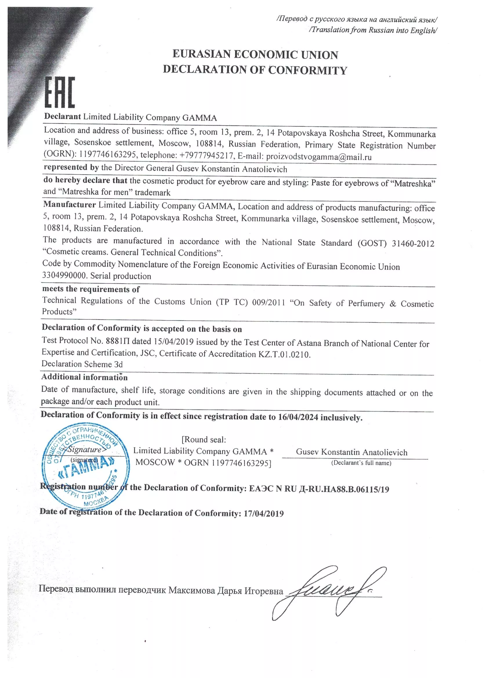 Способ применения: нанести пасту кистью по контуру бровей, придавая им желаемую форму.
