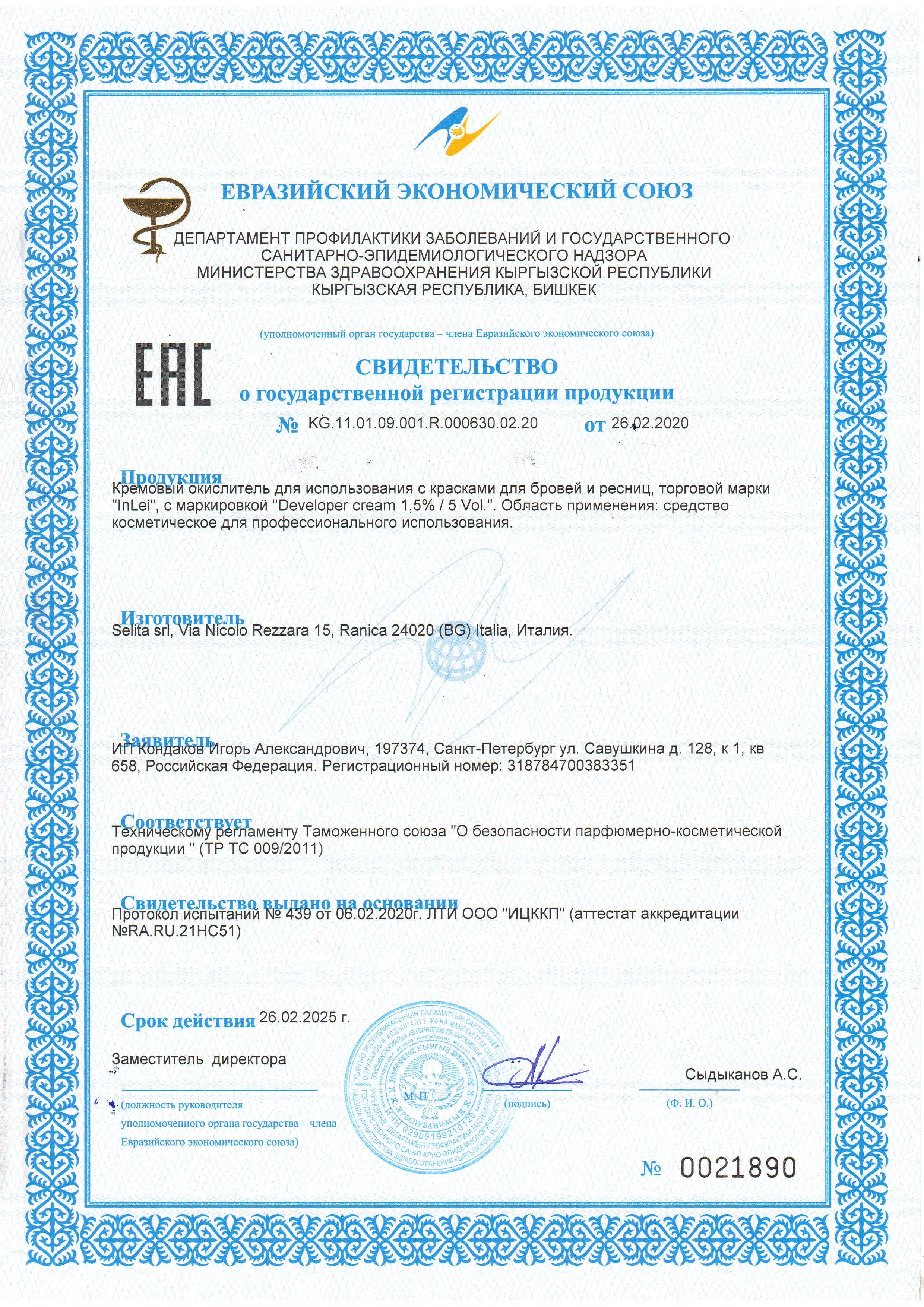 ТЕСТ НА ЧУВСТВИТЕЛЬНОСТЬ: У некоторых лиц продукт может вызвать серьезное воспаление кожи. Поэтому рекомендуется проводить тест на чувствительность за 48 часов до каждого нанесения. Следует снять серьги, если таковые имеются. Тщательно промыть мыльным раствором или спиртом квадратный сантиметр кожи за ухом или в локтевой впадине. Нанести небольшое количество смеси IN LEI® Tintura + IN LEI® «Develo- per Cream 1.5% 5vol.» и дождаться ее высыхания. Через 48 часов тщательно смыть теплой водой. Данный тест является важной мерой предосторожности. Отсутствие явных проявлений не исключает тот факт, что продукт может вызвать аллергическую реакцию в процессе последующих нанесений. В случае возникновения раздражения, зуда или покраснения — немедленно смыть продукт и не использовать его.