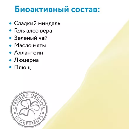 Состав: (INCI) Aqua, Glycerin, PEG-40 Hydrogenated Castor Oil, Hydrolyzed Sweet Almond Protein, Hydrolyzed Collagen, Organic Camelia Sinensis Leaf Extract*, Medicago Sativa (Alfalfa) Extract, Organic Mentha PIperita Leaf Extract*, Organic Aloe Barbadensis Gel*, Panthenol, Mentha Piperita (Peppermint) Oil, Sodium Laureth Sulfate, Allantoin, Benzyl Alcohol, Methylchloroisothiazolinone, Methylisothiazolinone